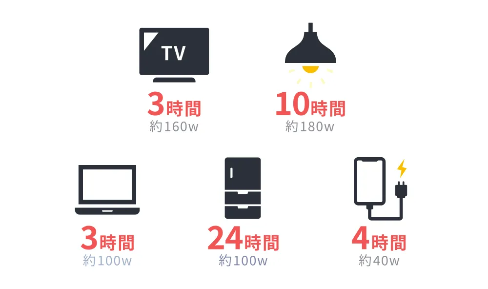 生活ができる6.5kWhの蓄電池をフル充電すると、上記機器を長時間利用できます。