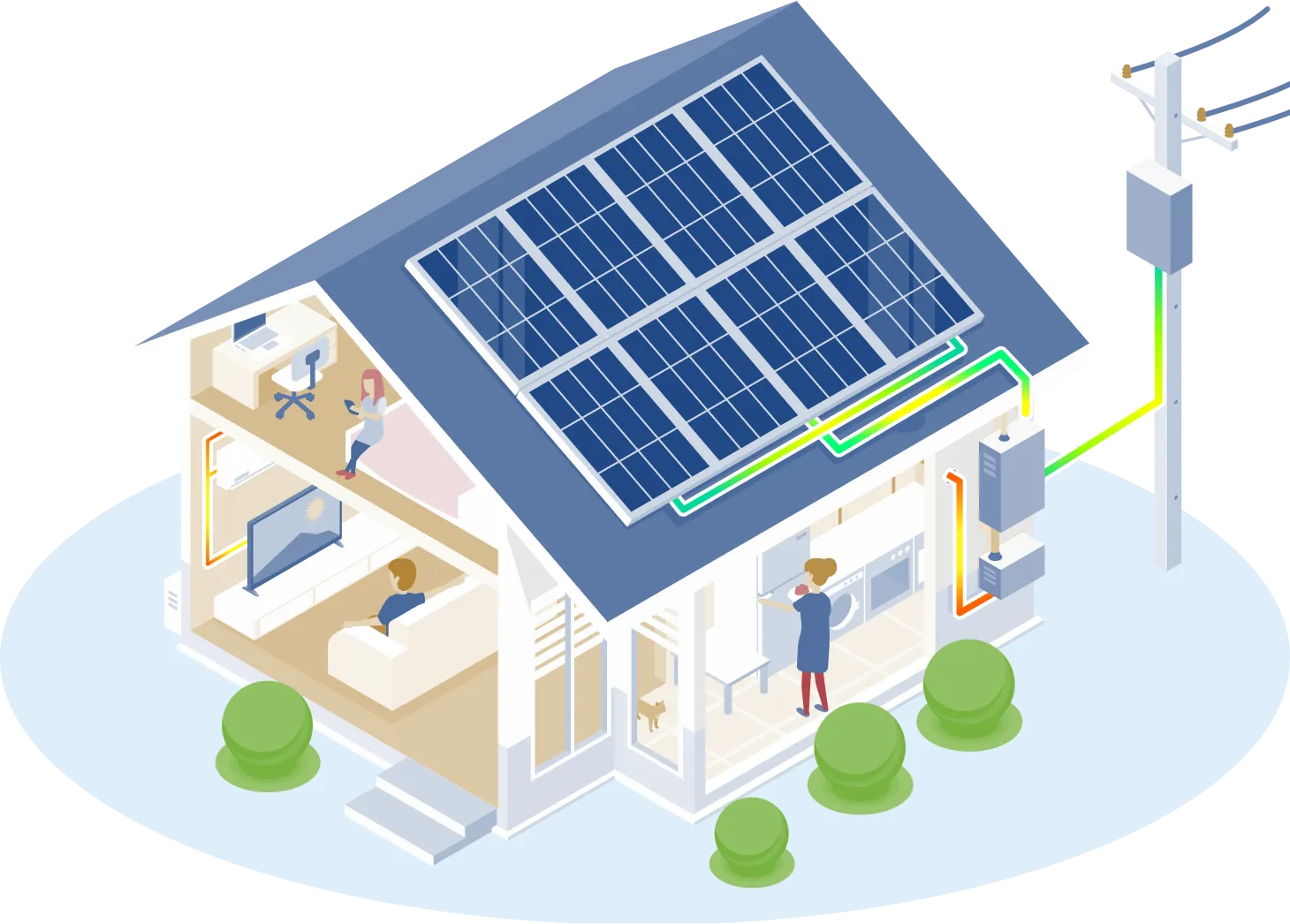蓄電池を設置することで、昼間にご自宅の太陽光パネルで作った電気を溜めておいて、夜間や天気が悪い日でも電気を使えるようにすることができます。